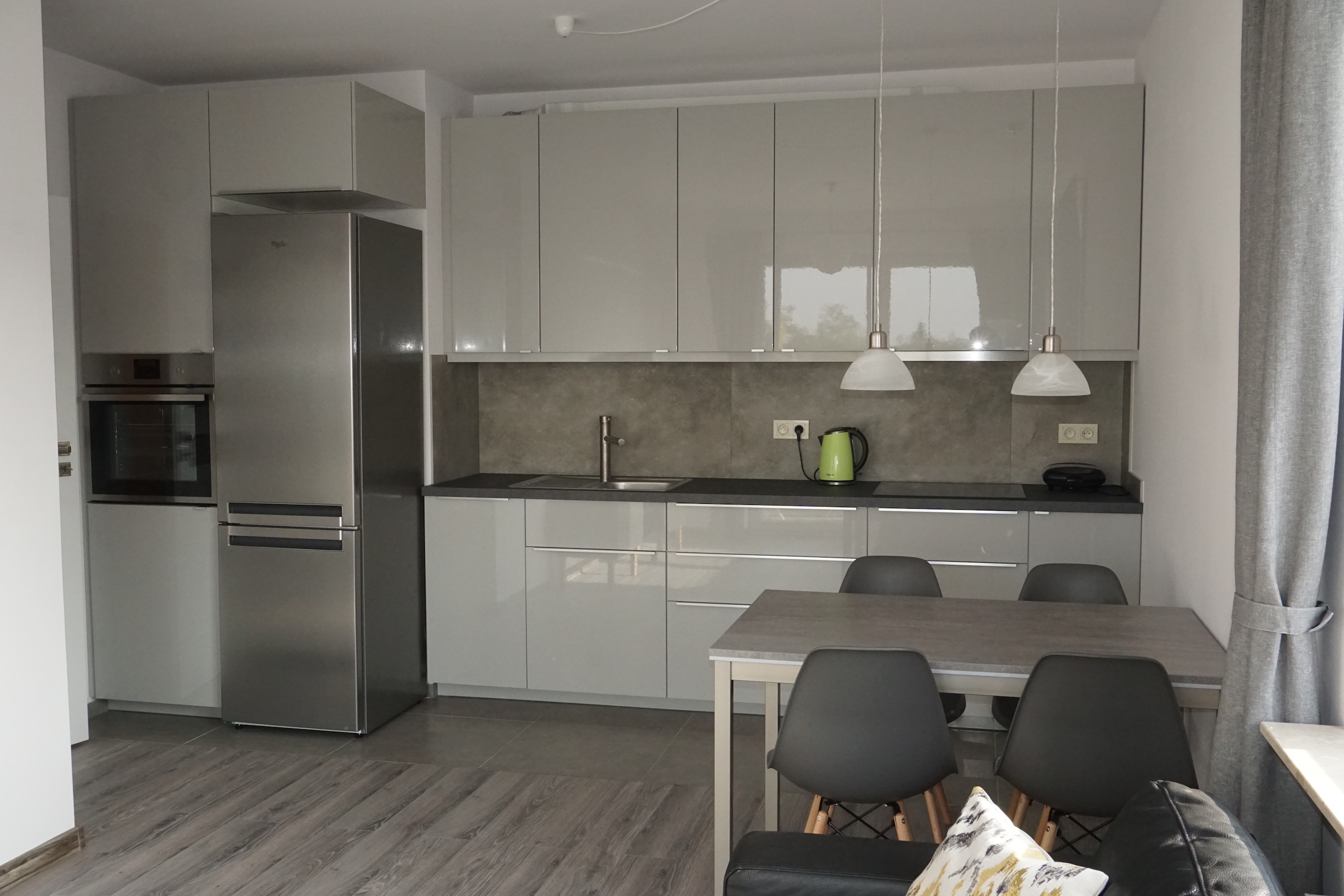 Mieszkanie zostało wykończone z bardzo dobrej jakości materiałów, urządzono je ze smakiem i ze szczególną starannością o funkcjonalność przy jednoczesnym zachowaniu poczucia przestrzeni. Mieszkanie jest w pełni umeblowane i wyposażone: kuchnia wyposażona w sprzęt AGD ( lodówka z zamrażalką, płyta elektryczna piecyk elektryczny, zmywarka, duża ilość szafek wiszących i stojących), przestronna sypialnie z dwuosobowym łóżkiem oraz szafą ubraniową, łazienka wyposażona w pralkę. Na korytarzu znajdują się dwie duże szafy w zabudowie typu Komandor. Okna PCV, na podłogach jasnoszare panele, w łazienkach i korytarzu kafle.